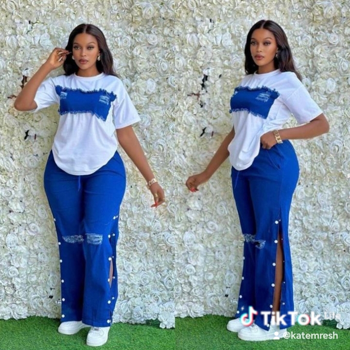 Two piece denim pallazo pants and T-shirt. Ava in all sizes, delivery done country wide